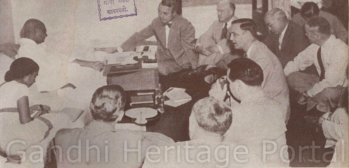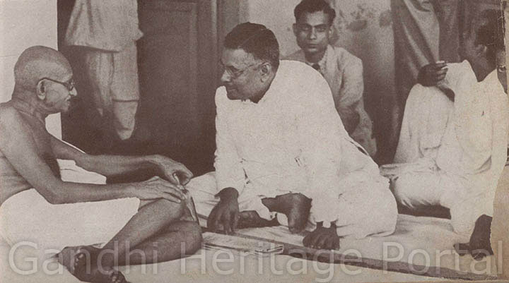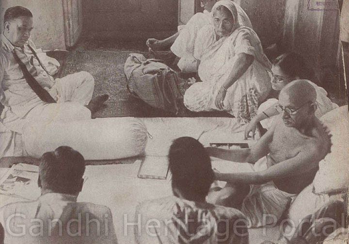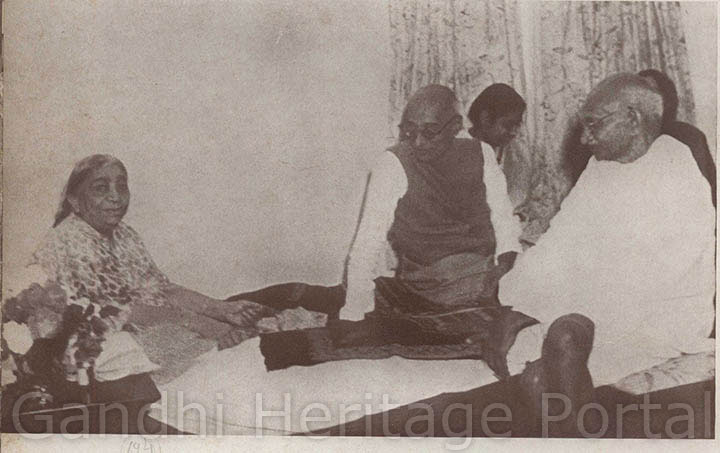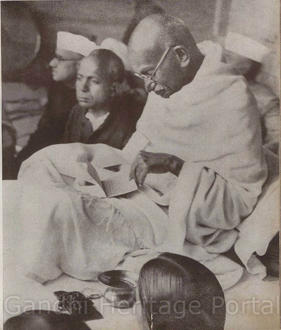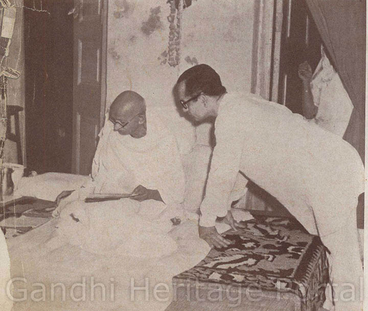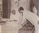 • Gandhiji recuperating from a fast he had undertaken to unite the two Communities; Dr. Dinshaw Mehta is attending him