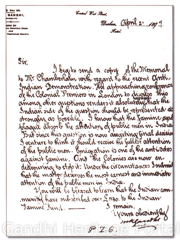 • Letter to friends in India intimating the plight of Indians in South Africa, 1897