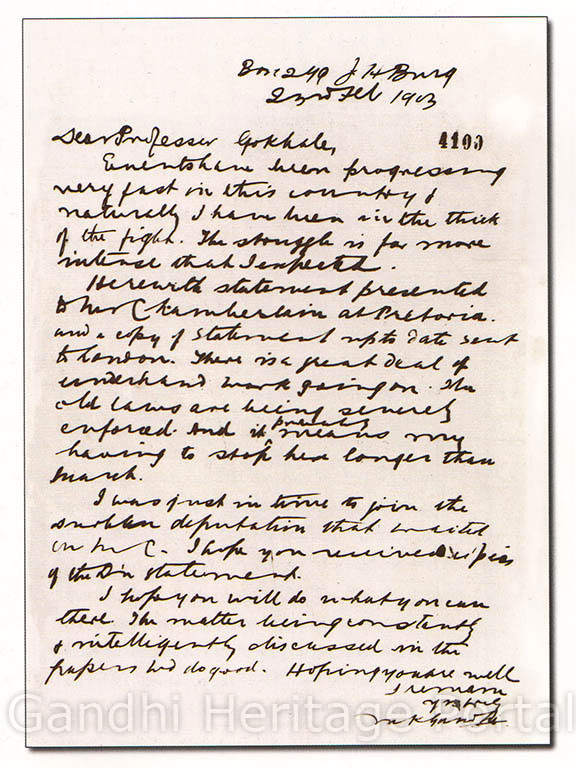 • Gandhi‘s letter to his political mentor, Gokhale, narrating developments in South Africa around 1903