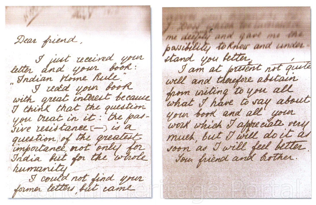 • A draft letter to Gandhi written by Tolstoy on May, 8, 1910