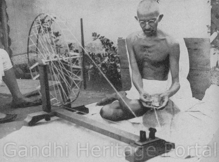 • Gandhi at the wheel, Sabarmati Ashram, 1925