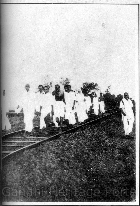 • Gandhi, on his evening walk, accompanied by Kasturbai, Vallabhbhai Patel, and Mirabehn, Sabarmati, 1929