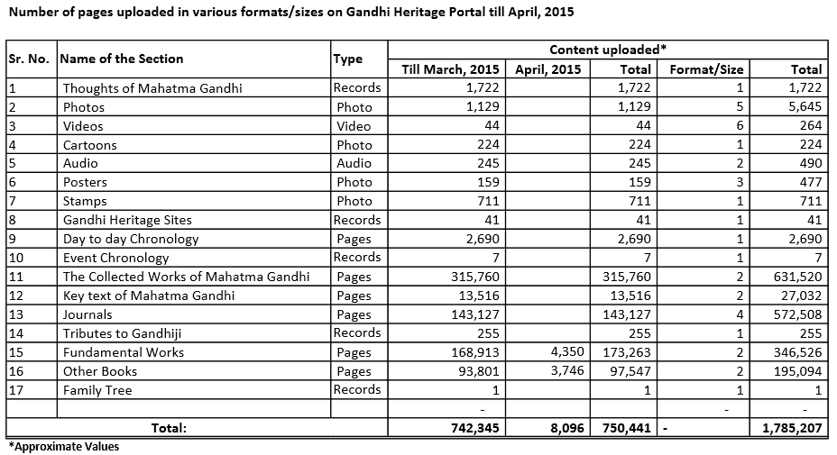 Summary of content uploaded till April, 2015 in various formats/sizes on Gandhi Heritage Portal.