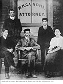 • Gandhi with his secretary, Sonia Schlesin, and Mr. Polak in front of his office in Johannesburg, 1905