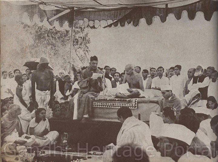 • Tagore delivering the address of welcome to Gandhi and Kasturbai, Amra-Kunj, Santiniketan, February 18, 1940