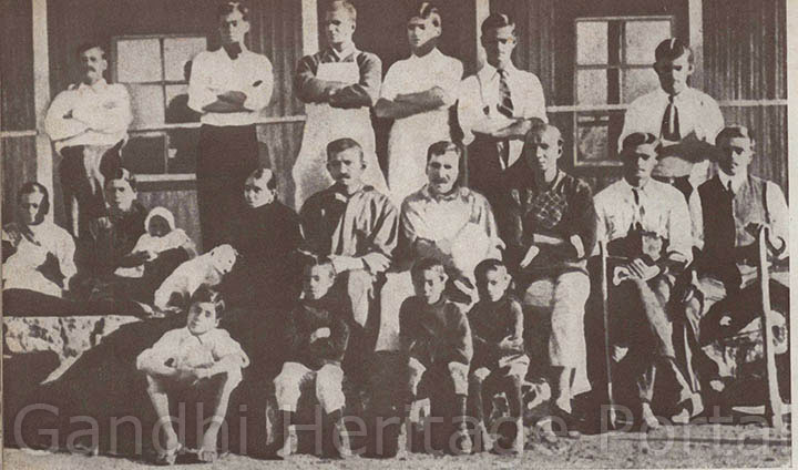 • Gandhi and Kallenbach with the pioneer settlers at Tolstoy Farm