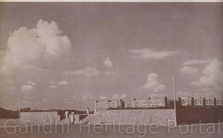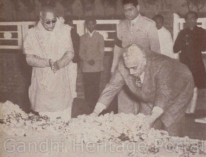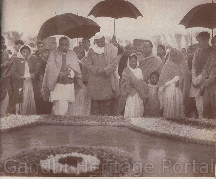 • President Rajendra Prasad, his wife, Rajvanshi Devi, and Sardar Vallabhbhai Patel at the samadhi