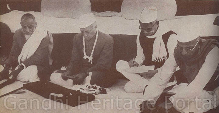 • Prayer meeting at the Sabarmati Ashram on the birthday of Gandhiji : Purushottamdas Tandon, Jawaharlal Nehru, Mavalankar and Morarji Desai taking part in the spinning