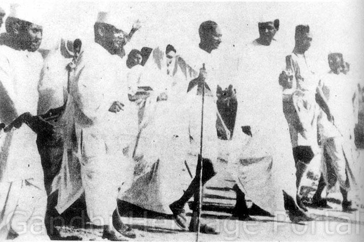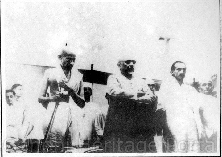 • Gandhi with Vallabhbhai Patel and Mrs. Naidu at the flag salutation ceremony during the Ahmedabad session of the Congress, December 1921