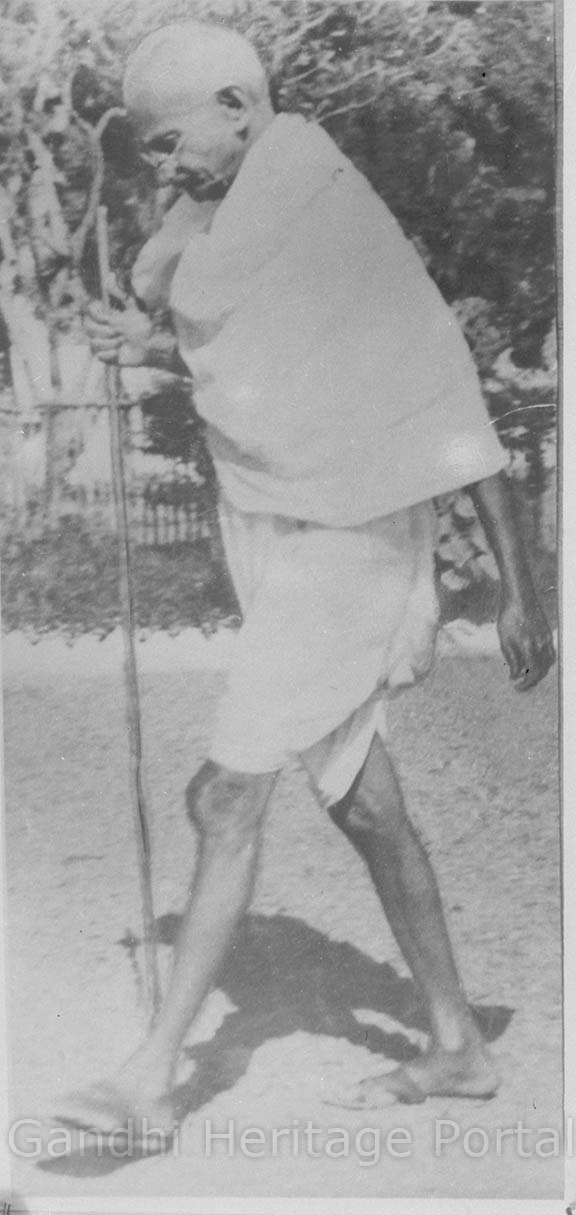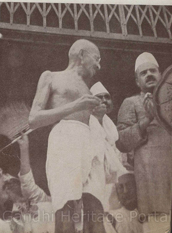 • Gandhi at the wheel during the A.I.C.C. session, Bombay, July 1946