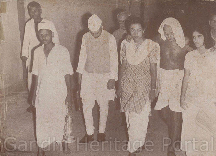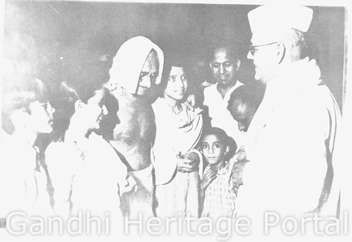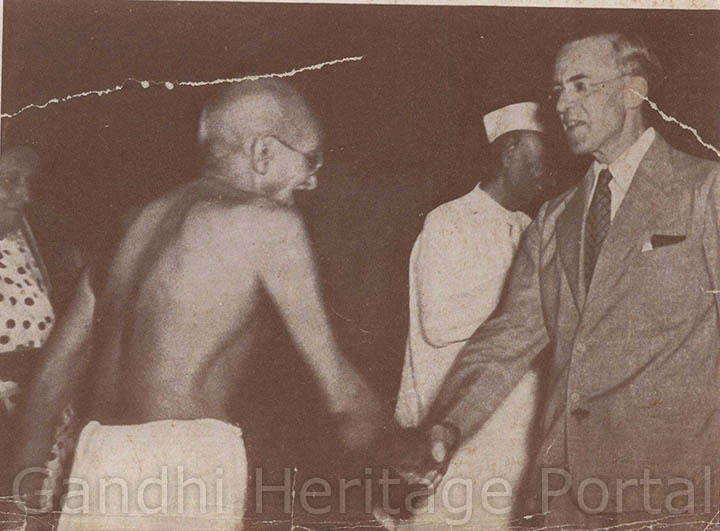 • Gandhi greets Sir Stafford Cripps at the Bhangi Colony, Delhi, April 1946
