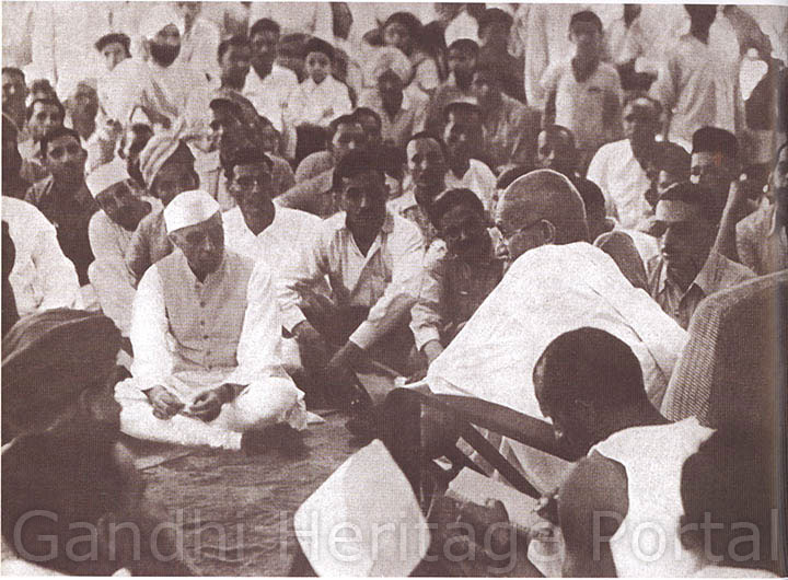 • Addressing members of the Indian National Army at the Bhangi Colony, 1945; Pandit Nehru is in the foreground