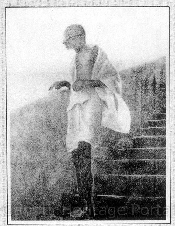 • Gandhi in the corridor of Gujarat Vidyapith, on the way to hold a Bible cource, 1929