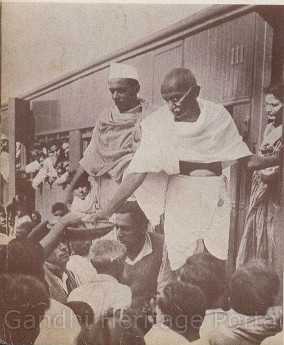 • Collecting money for the Harijan Fund on his way to Poona, June 15, 1944