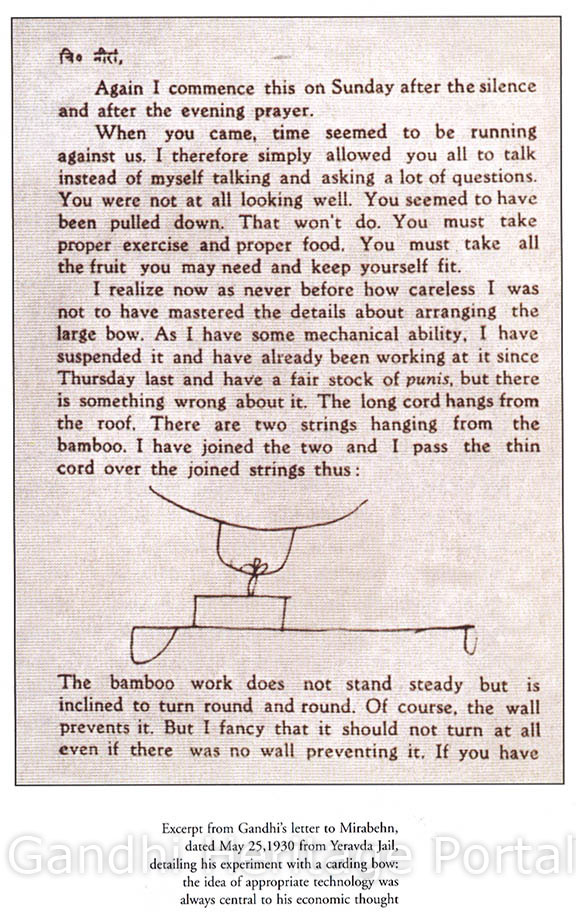 • Gandhi‘s letter to Mirabehn, dated Yeravda, May 25, 1930, detailing with a drawing his experiment with a carding bow