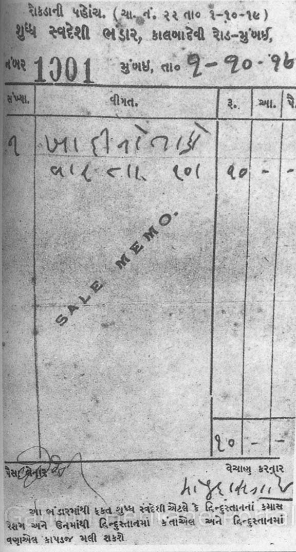 • Sale memo of khadi piece prepared by Gandhi at the opening ceremony of Shuddha Swadeshi Bhandar, Kalbadevi, Bombay, October 1, 1919