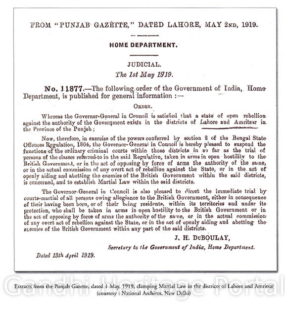 • Extracts from the Punjab Gazette, dated 1 May, 1919, clamping Martial Law in the districts of Lahore and Amritsar