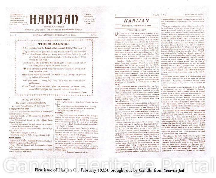 • The first issue of Harijan, dated February 11, 1933, conducted by Gandhi from Yeravda Central Prison