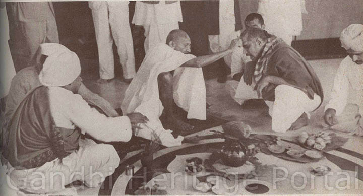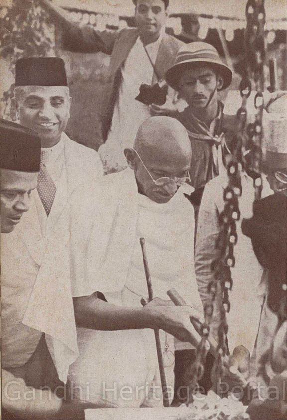 • Gandhi performing the ceremony of laying the corner-stone of Kamala Nehru Memorial Hospital, Allahabad, November 19, 1939