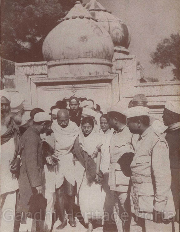 • Gandhiji visiting the mosque of Khwaja Kutbuddin at Mehrauli, Near Delhi, January 27, 1948