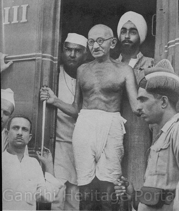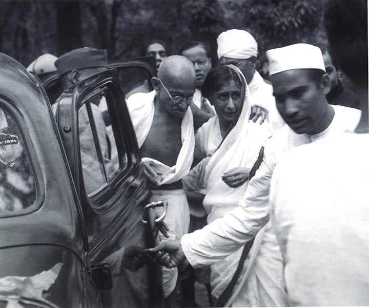 • Gandhi being carried to the prayer ground after the fast, January 20, 1948