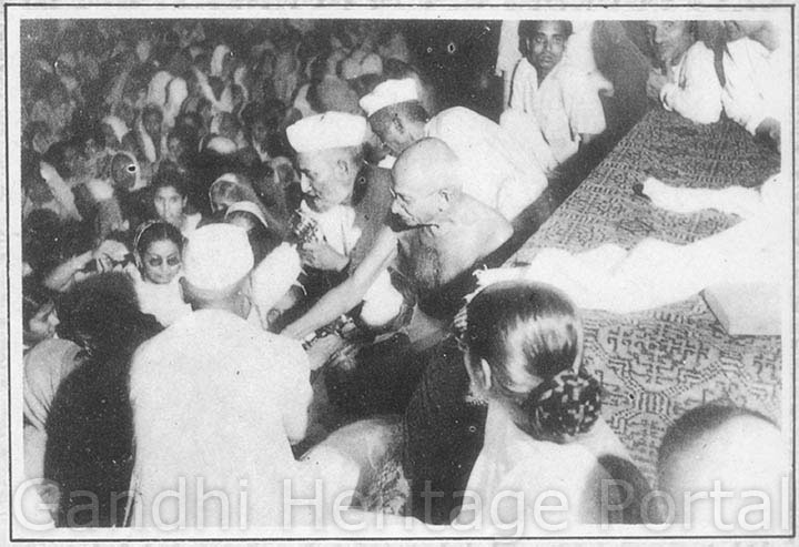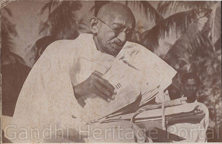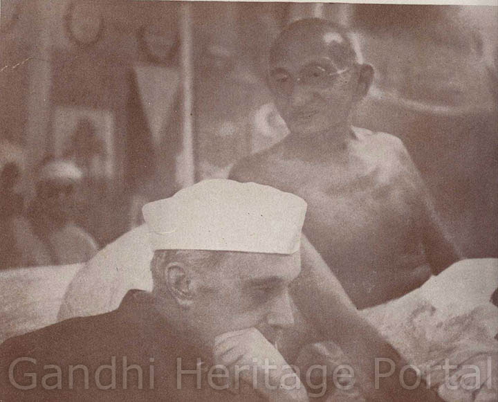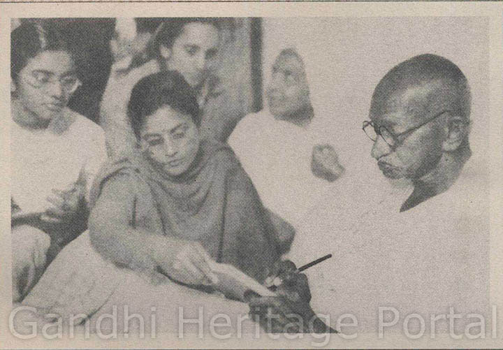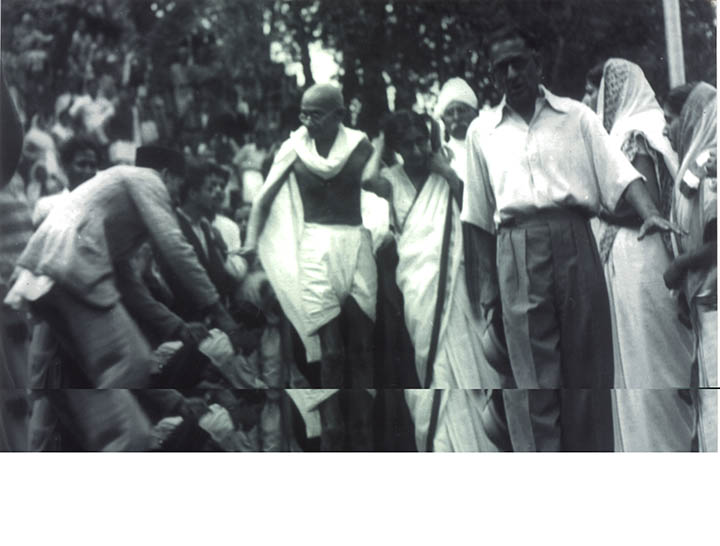 • Collecting funds for riot victims; Professor Abdul Bari, Bihar Congress Leader, is next to Gandhiji