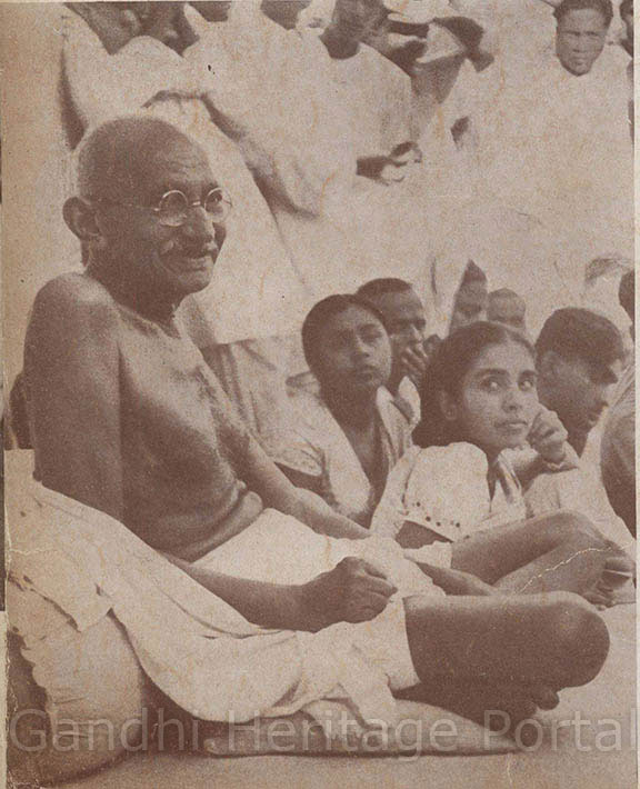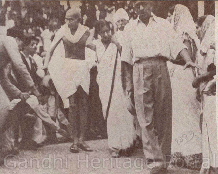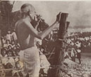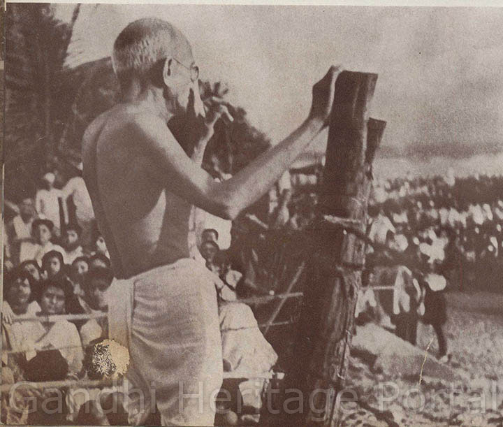 • Gandhi addressing the beach meeting-on the dais are S. Satyamurti and Srinivas Iyengar