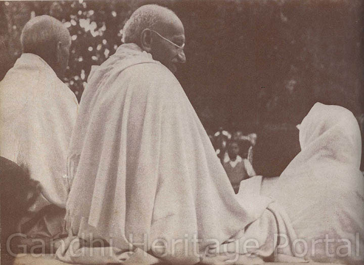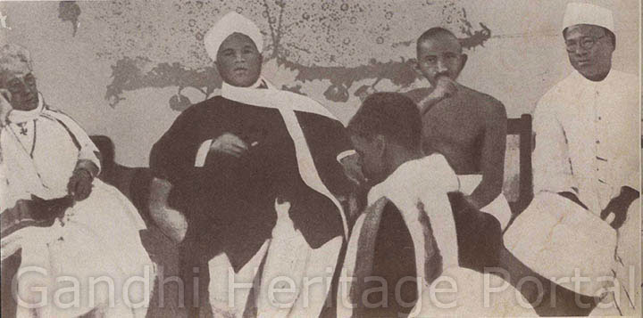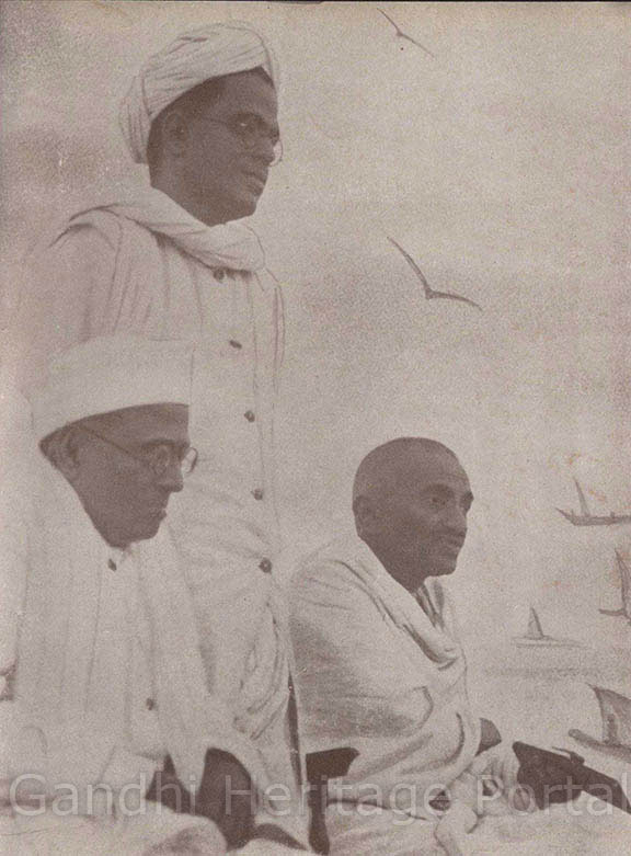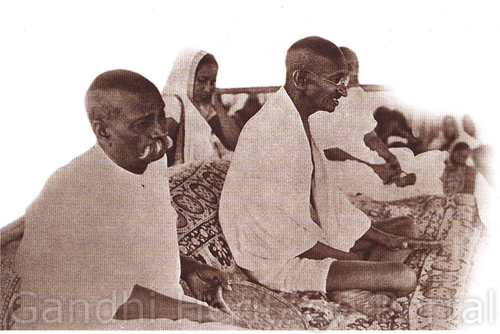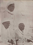 • Gandhi with Sardar Patel at a public meeting, 1921; reaffirming, faith in Satyagraha