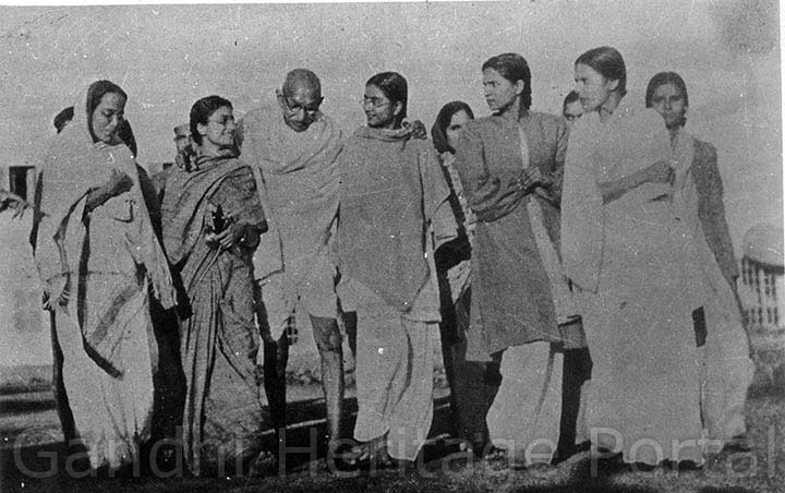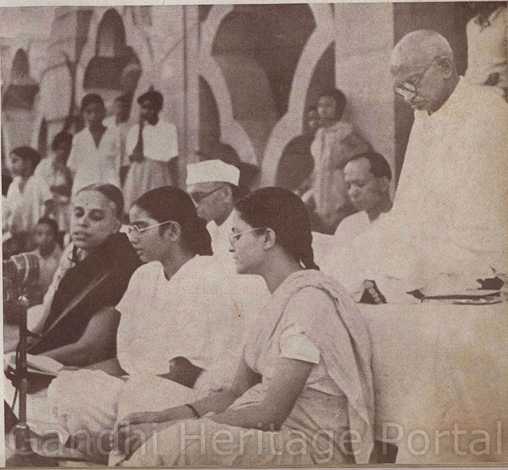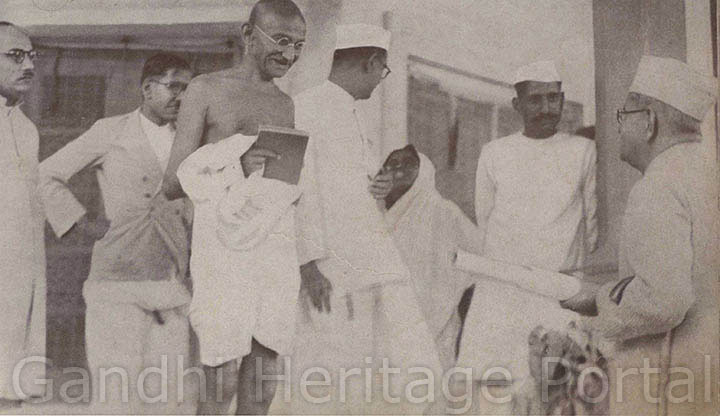 • Arriving at a prayer meeting in Delhi, 1945; with him are Khan Abdul Ghaffar Khan, Jawaharlal Nehru and Acharya Kripalani