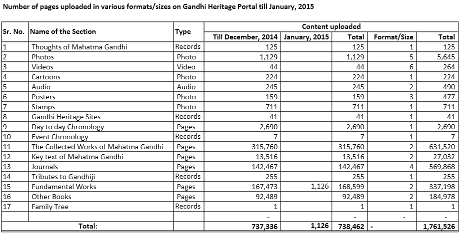 Summary of content uploaded till January, 2015 in various formats/sizes on Gandhi Heritage Portal.